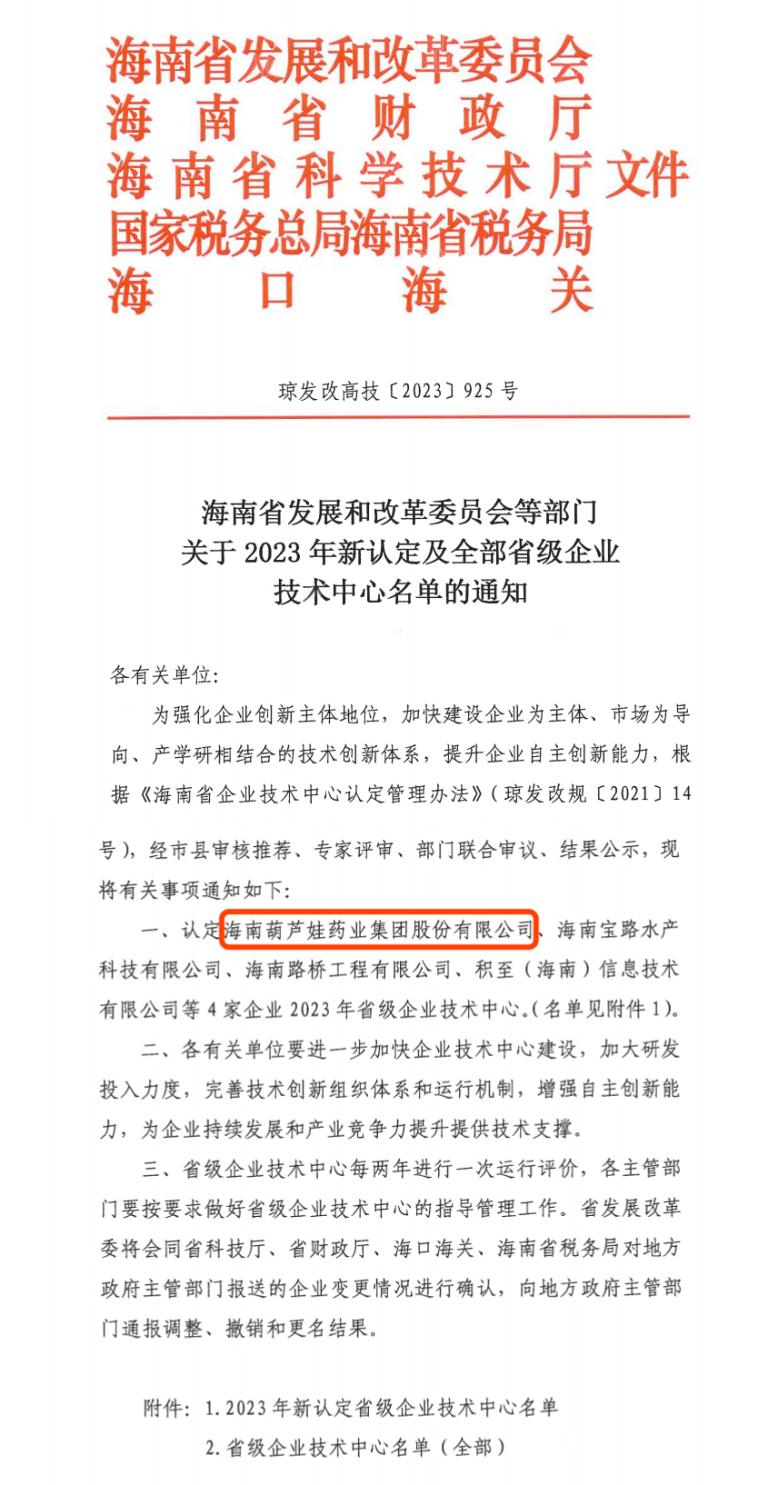 近日,海南省发改委等多部门联合公布了《关于2023年新认定及全部省级企业技术中心名单的通知》,其中,海南永乐高药业集团股份有限公司成功通过评审,被认定为省级企业技术中心,是本次获批的4家企业之一。
